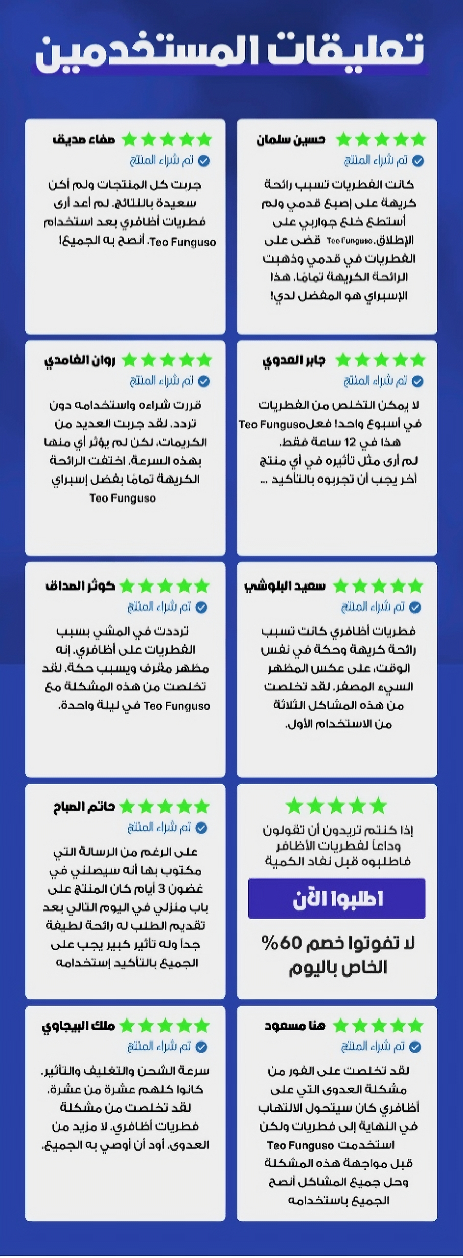 حتى أنا كان عندي مشكل كبير مع ريحة الرجلين والفطريات ديال الأظافر. منين استعملت زيت علاج الأظافر بقيت مرتاحة، رجلي ولاو نقيين والأظافر زوينين بلا مشاكل. شكراً بزاف على المنتوج الفعال وطبيعي